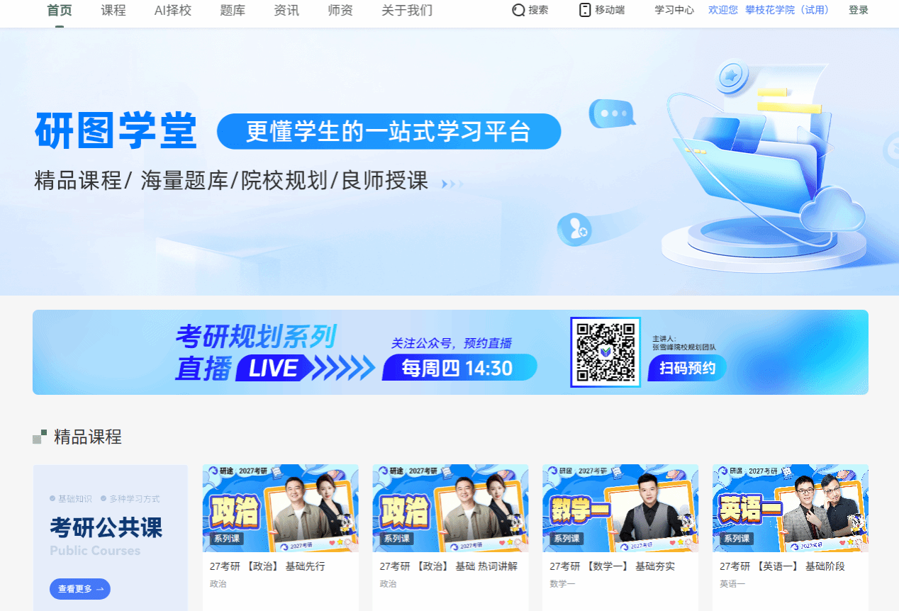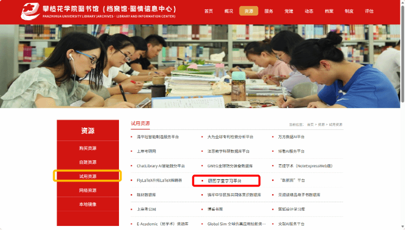登录“攀枝花学院图书馆官网”→“资源”→“试用资源”→“研图学堂学习平台”